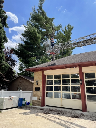 The Members not only answer calls for service they also help keep the building clean. Fire Chief Kevin Patti and JR Firefighter Chris Patti clean the gutters at the station.